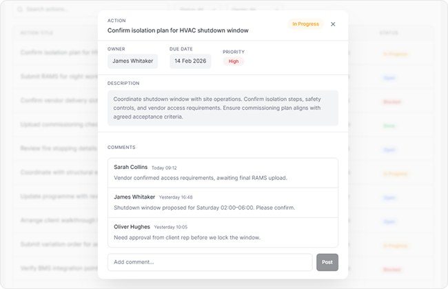 - Meetings, decisions, and actions logged in context