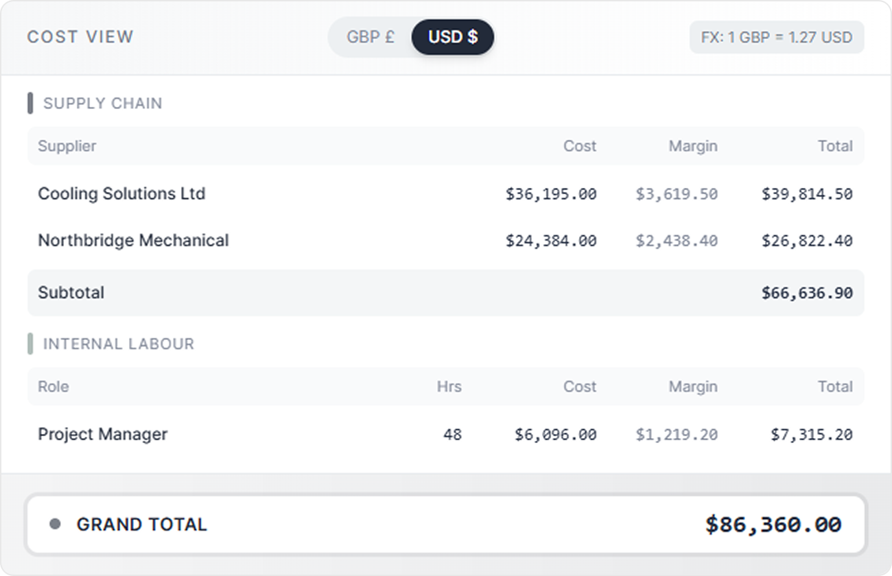 - Internal labor and supply chain costs captured upfront